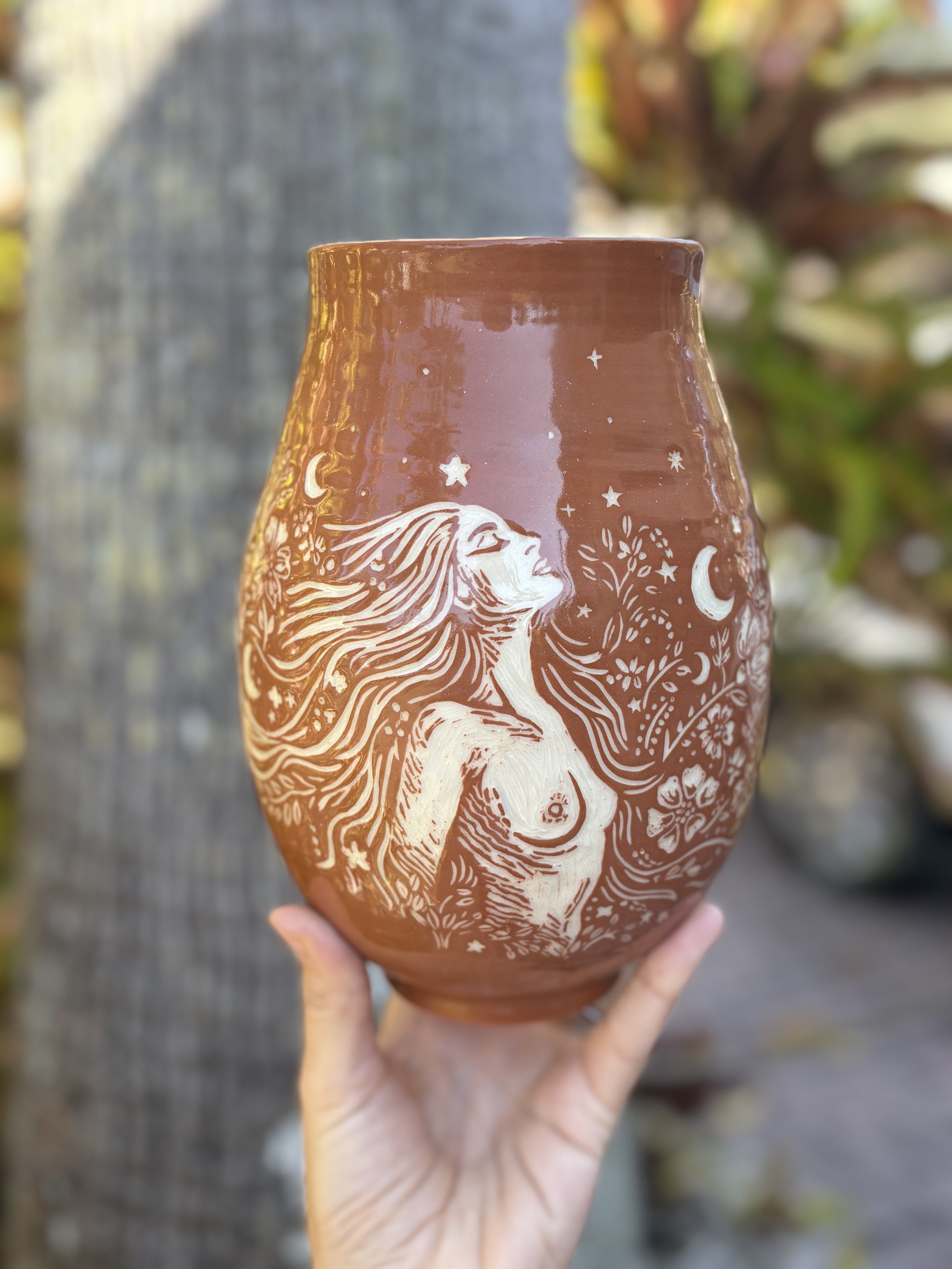 Her work combines wheel-throwing, sgraffito carving, and quiet storytelling—pieces that hold softness, symbolism, and the beauty of becoming.